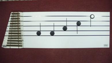Med magnetiska nottecken och ALTKLOCKSPEL (noternas placering motsvarar lägena på klockspelets klingande stavar). Lämplig för den grundläggande undervisningen i notkunskap. Visar på ett pedagogiskt sätt förhållandet mellan noter och de klingande tonerna.Klockspelet är enradigt (diatoniskt). Dock medföljer även tonerna B (Bb) + C# + F# samt 1 st klubba.